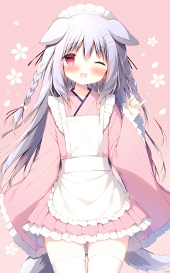 best-A, (shiratama_\(shiratamaco\)),1girl, wa maid, dog ears, solo, kimono, one eye closed, animal ears, dog tail, japanese clothes, white thighhighs, frills, long hair, ;d, tail, maid headdress, dog girl, smile, floral background, apron, frilled apron, frilled kimono, thighhighs, white apron, red eyes, bone hair ornament, blush, long sleeves, sleeves past wrists, skirt, pink kimono, hair between eyes, bangs, wide sleeves, open mouth, very long hair, hair ornament, pleated skirt, pink background, braid, frilled skirt, hand up, cartoon bone, frilled sleeves, bow , masterpiece, best quality