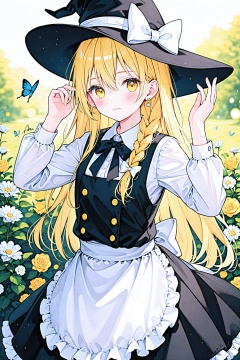 masterpiece,best quality,illustration,ultra detailed,hdr,Depth of field,(colorful),Artist ame929,1girl,hat,kirisame marisa,blonde hair,solo,yellow eyes,bug,witch hat,butterfly,long hair,braid,bow,flower,apron,black headwear,single braid,long sleeves,hair ornament,earrings,jewelry,white bow,hair flower,shirt,white shirt,closed mouth,hair between eyes,waist apron,white apron,black bow,white flower,hat bow,black skirt,blush,bowtie,skirt,black bowtie,looking at viewer,rose,hair bow,vest,black vest,frills,signature,buttons,hand on headwear,