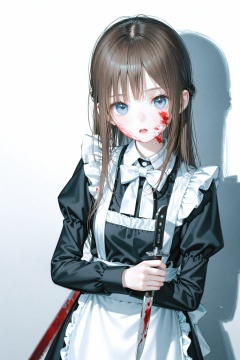 masterpiece,best quality,illustration,ultra detailed,hdr,Depth of field,(colorful),[iumu],[Artist chen bin],Artist roha, 1girl, solo, holding, long hair, blue eyes, blood, apron, knife, looking at viewer, maid, brown hair, blood on face, long sleeves, holding knife, dress, black dress, bow, shadow, juliet sleeves, white bow, maid apron, weapon, white bowtie, puffy sleeves, white apron, open mouth, blood on clothes, bowtie, holding weapon, simple background, breasts, jewelry, parted lips, upper body, off shoulder