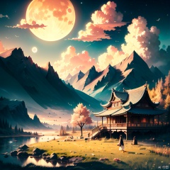 outdoor, sky, clouds, trees, no one, night, moon, meadow, landscape, full moon, rocks, mountains, architecture, east asian architecture, peach blossom grove, girl