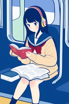 1girl, solo, long hair, blush, bangs, blue eyes, skirt, shirt, black hair, long sleeves, bow, holding, sitting, school uniform, blue hair, pleated skirt, serafuku, socks, bowtie, sailor collar, red bow, blue skirt, book, headphones, cardigan, holding book, open book, reading, train interior