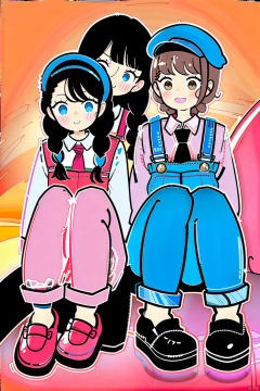 long hair, blush, smile, short hair, open mouth, bangs, multiple girls, skirt, shirt, black hair, long sleeves, hat, twintails, sitting, white shirt, braid, red hair, hairband, necktie, shoes, collared shirt, pants, black footwear, vest, twin braids, black headwear, 6+girls, brown footwear, red necktie, pink shirt, overalls, blue overalls