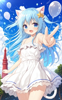 Best-A,yano_mitsuki_\(nanairo\),1girl, \:d, aircraft, animal_ears, arm_up, armpits, balloon, bare_arms, bare_shoulders, blue_eyes, blue_hair, blue_sky, blush, bubble, cat_ears, cat_tail, commentary, cowboy_shot, day, dress, empire_waist, fang, head_tilt, hot_air_balloon, long_hair, looking_ahead, looking_at_viewer, mint_\(uchi_no_pet_jijou\), off-shoulder_dress, off_shoulder, open_mouth, outdoors, outstretched_arm, pointing, sky, smile, solo, spaghetti_strap, star_\(symbol\), star_in_eye, symbol-only_commentary, symbol_in_eye, tail, tareme, tower, uchi_no_pet_jijou, white_dress, yano_mitsuki_\(nanairo\)