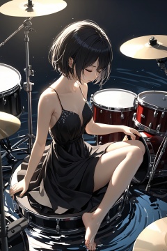 breathtaking girl, solo, short hair, black hair, dress, bare shoulders, sitting, closed eyes, barefoot, water, black dress, drum set, backlight, colors . award-winning, professional, highly detailed