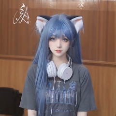1girl,headphones_around_neck,headphones,solo,animal_ears,cat_ears,long_hair,blue_hair,arms behind back,<lora:da:0.8>,