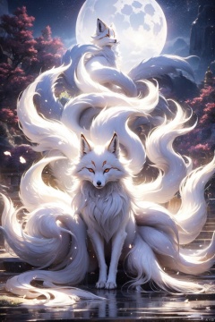 The nine-tailed fox is covered with white and flawless hair, and its nine fluffy tails surround it like a cloud, during which the light and shadow effect, the moonlight is sprinkled on the nine-tailed fox, emitting a soft glow, The color is silver white, the visual Angle looks upward, showing the majesty and beauty of the fox, the quality is delicate, full of dynamic.   The painting was asked to express the mystical charm of the spirit of the nine-tailed fox, echoing the ancient atmosphere of the shrine.   To create a supernatural atmosphere, nine tail bar is very beautiful.