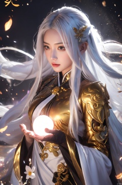 a woman with white hair holding a glowing ball in her hands, white haired deity, by Yang J, heise jinyao, inspired by Zhang Han, xianxia fantasy, flowing gold robes, inspired by Guan Daosheng, human and dragon fusion, cai xukun, inspired by Zhao Yuan, with long white hair, fantasy art style,,Ink scattering_Chinese style, smwuxia Chinese text blood weapon:sw, lotus leaf, (\shen ming shao nv\), gold armor, a boy_gmlwman, wunv, Nine tails, a dragon, lbb, jyy-hd