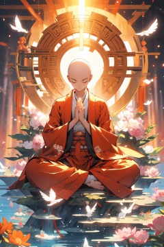 monk, 1boy, bald, solo, prayer beads, leaf, flower, wide sleeves, closed eyes, long sleeves, dove, closed mouth, full body, sunlight, bird on hand, water, sun, ripples, looking down,sit cross-legged,light particle,put your hand on your chest,chinese monk's white kasaya clothes,circular Pattern Background,buddha beads around the neck, highlights on the top of the head, <lora:yiling_玉面小僧:0.8>