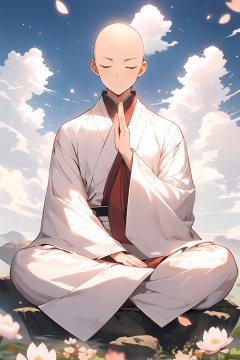 monk, solo, bald, cloud, 1boy, closed eyes, male focus, sky, petals, flower, outdoors, full body, long sleeves, cloudy sky, wide sleeves, day, closed mouth, blue sky, rock,sit cross-legged,highlights on the top of the head, light particle, foreground blurring, chinese monk's white kasaya clothes,Hands folded, looking down <lora:yiling_玉面小僧:0.8>