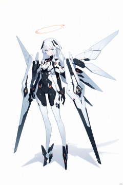 score_9, score_8_up, score_7_up, score_6_up,jijia, 2d, anime, 1girl, halo, solo, white hair, mecha musume, weapon, wings, long hair, holding, full body, holding weapon, looking at viewer, bodysuit, shield, science fiction, thighhighs, shadow, standing, mechanical halo,a drawing of a woman with wings and a halo,a cartoon character with many guns and a halo