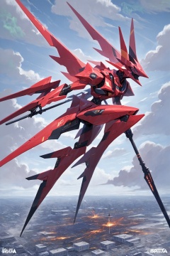 score_9, score_8_up, score_7_up, score_6_up,jijia, 2d, anime, weapon, polearm, cloud, flying, holding, holding weapon, mecha, sky, holding polearm, solo, science fiction, robot, city, no humans, cityscape, smoke, cloudy sky,a painting of a red spaceship flying over a city,a giant red spaceship flying above a city in flames