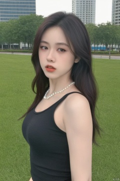 A woman with long hair wearing a pearl necklace,taking a selfie with a pouting kiss expression. She is dressed in a black sleeveless top. The setting is outdoors,likely in a public space with a grassy area and modern buildings. Natural lighting illuminates her from the side.,