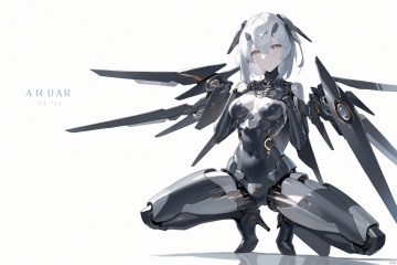 score_9, score_8_up, score_7_up, score_6_up,jijia, 2d, anime, 1girl, solo, grey eyes, squatting, breasts, looking at viewer, mecha musume, hand on own chest, android, medium breasts, mechanical wings, white eyes, wings, white background, high heels, simple background, grey hair, joints, robot joints, hair between eyes, white hair,a picture of a woman in armor with a sword,a female robot in silver lingerie with a gun on her side