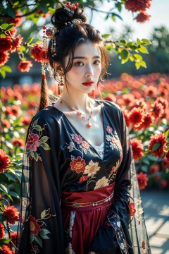 masterpiece, best quality, realistic, 1girl, gufeng style, solo, looking at viewer, black hair, hair ornament, jewelry, earrings, necklace, hair bun, blurry, lips, chinese clothes, cowboy shot, realistic, red lips, outdoors, day, sky, cloud, tree <lora:GufengBD-000016:0.7>