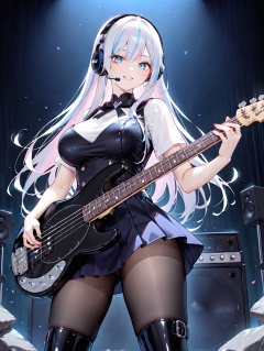 1lady playing bass guitar,solo,rock_n_roll,standing,dynamic angle,beautiful eyes,long hair,streaked hair,Himecut,sailorfuku,big breast,eibow glove,little smile,lovestruck,earphone,thighboots,pantyhose,speaker,amplifier,very aesthetic, masterpiece, best quality, absurdres, <lora:musicman-stingray4-bass:1>