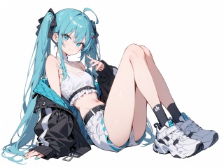 best quality, girl, solo, long hair, socks, twintails, very long hair, shorts, simple background, white background, sitting, jacket, shoes, sneakers, looking at viewer, shirt, holding, blue eyes, hair between eyes, belt, closed mouth, white shirt, fingernails, blue hair, hair ornament, ribbon, smile, aqua hair, full body, off shoulder,long sleeves, nail polish, turtleneck, crop top, open jacket, hair ribbon, eyelashes, alternate costume, bangs, aqua eyes, see-through, open clothes, midriff, white footwear, frills, sleeveless, bare shoulders, collarbone, sidelocks, from side, looking to the side, ahoge,  sleeves past wrists