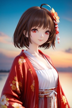 masterpiece,best quality,illustration,ultra detailed,hdr,Depth of field,(colorful),artist mmd,night,1girl,solo,red eyes,looking at viewer,hair ornament,short hair,upper body,brown hair,blurry,ahoge,bangs,see-through,depth of field,hanfu,smile,floral print,closed mouth, , , , ,