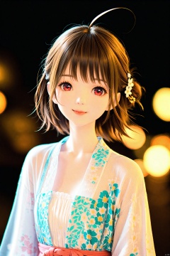 masterpiece,best quality,illustration,ultra detailed,hdr,Depth of field,(colorful),artist mmd,night,1girl,solo,red eyes,looking at viewer,hair ornament,short hair,upper body,brown hair,blurry,ahoge,bangs,see-through,depth of field,hanfu,smile,floral print,closed mouth, , , , ,