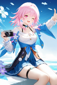 masterpiece,best quality,high quality,(colorful),Artist rafaelaaa, 1girl, camera, march 7th (honkai: star rail), solo, pink hair, one eye closed, tied jacket, skirt, shirt, white shirt, jacket, open mouth, pink eyes, holding, medium hair, long sleeves, blue eyes, smile, holding camera, blue skirt, choker, pleated skirt, blue jacket, sitting, two-tone eyes, upper teeth only, thigh strap, black corset, teeth, medium breasts, breasts, flower ornament, corset, black choker, miniskirt, jewelry, from side, outstretched arm, ;d, , , , ,
