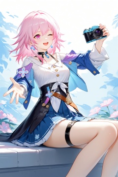 masterpiece,best quality,high quality,(colorful),Artist rafaelaaa, 1girl, camera, march 7th (honkai: star rail), solo, pink hair, one eye closed, tied jacket, skirt, shirt, white shirt, jacket, open mouth, pink eyes, holding, medium hair, long sleeves, blue eyes, smile, holding camera, blue skirt, choker, pleated skirt, blue jacket, sitting, two-tone eyes, upper teeth only, thigh strap, black corset, teeth, medium breasts, breasts, flower ornament, corset, black choker, miniskirt, jewelry, from side, outstretched arm, ;d, , , , ,