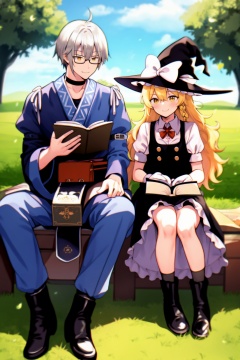 masterpiece, best quality,<lora:MorichikaRinnosuke:1>,1girl, morichika rinnosuke, kirisame marisa, 1boy, book, glasses, puffy sleeves, smile, sitting, yellow eyes, long hair, hat, boots, hat removed, blonde hair, holding, long sleeves, headwear removed, apron, short sleeves, choker, holding book, tree, braid, grass, witch hat, ahoge, bow, shirt, white shirt, bangs, single braid, black headwear, petticoat, white apron, waist apron, puffy short sleeves, white bow, hair between eyes, bridal gauntlets, pants, brown footwear, hat bow, open book, socks, outdoors, frills, hair bow, gloves, black skirt, skirt, hetero, short hair, black vest, hand up, dress, black footwear, black gloves, grey hair, black dress, vest, semi-rimless eyewear, full body, leaf, looking at another, day, collarbone, wide sleeves, frilled apron, white hair, black choker, high heels, sash