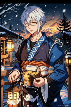 masterpiece, best quality,<lora:MorichikaRinnosuke:1>,morichika rinnosuke, 1boy, solo, male focus, letterboxed, glasses, snow, lantern, ahoge, yellow eyes, snowing, mountain, tree, long sleeves