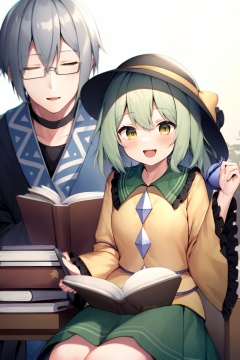 masterpiece, best quality,<lora:MorichikaRinnosuke:1>,1girl, komeiji koishi, 1boy, morichika rinnosuke, hat, book, glasses, green hair, third eye, closed eyes, cup, yellow eyes, open mouth, frills, smile, black headwear, long sleeves, yellow shirt, choker, short hair, holding, wide sleeves, reading, green skirt, open book, grey hair, skirt, shirt, holding book, ribbon, sitting, hat ribbon