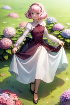 masterpiece, best quality, <lora:lemrina:1>,lemrina vers envers, 1girl, solo, flower, hairband, dress, blue eyes, bob cut, skirt hold, short hair, pink hair, blunt bangs, smile, bangs, hydrangea, puffy sleeves, curtsey, shoes, juliet sleeves, long sleeves, grass