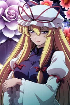 masterpiece, best quality, <lora:tgm-v2:1>,pixiv,  1girl, yakumo yukari, blonde hair, hat, floral background, solo, long hair, purple eyes, flower, tabard, ribbon, breasts, mob cap, arm ribbon, hat ribbon, large breasts, long sleeves, dress, looking at viewer, bow, hair bow, smile, white dress, puffy sleeves, hair between eyes, wide sleeves, bangs, parody, very long hair, sidelocks, frills, lips, red bow, hair ribbon, upper body, red ribbon, juliet sleeves, white headwear, pink flower