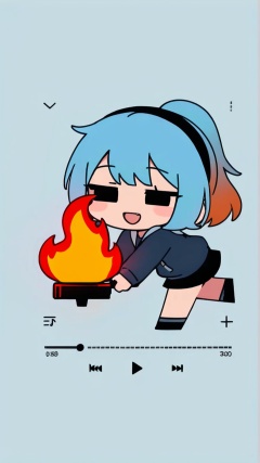 masterpiece, best quality, <lora:mikuoeo-xl-a3.1:1>,1girl, solo, fire, chibi, grey background, smile, blue hair, open mouth, simple background, full body, skirt, :d, long sleeves, blush stickers, solid oval eyes, black skirt, short hair, bangs, standing, black footwear, hood, ponytail, hoodie, hairband