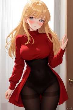 mnmhf,(masterpiece, best quality), 1girl, blonde hair, red dress, pantyhose, cute face, blush<lora:EMS-344925-EMS:0.800000>