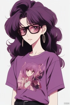 mnmhf,1girl, glasses, solo, long hair, jewelry, shirt, earrings, purple shirt, purple eyes, t-shirt, looking at viewer, upper body, retro artstyle, print shirt, wavy hair, purple hair, round eyewear, messy hair, short sleeves<lora:EMS-344925-EMS:0.800000>