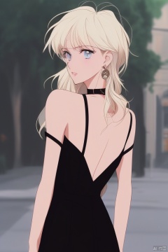 mnmhf,1girl, blonde hair, jewelry, earrings, dress, blue eyes, choker, looking at viewer, solo focus, looking back, bare shoulders, upper body, from behind, solo, blurry, blurry background, off shoulder<lora:EMS-344925-EMS:0.800000>