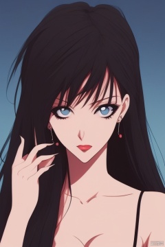 mnmhf,1girl, solo, black hair, mole under mouth, long hair, mole, breasts, nail polish, makeup, looking back, lipstick, red nails, blue eyes, large breasts, strap slip<lora:EMS-344925-EMS:0.800000>