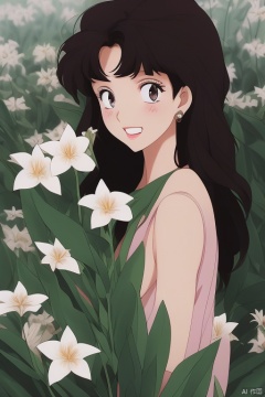 mnmhf,1girl, flower, solo, long hair, looking at viewer, black hair, white flower, hair flower, lily \(flower\), hair ornament, watermark, closed mouth, portrait, from side, upper body, leaf<lora:EMS-344925-EMS:0.900000>