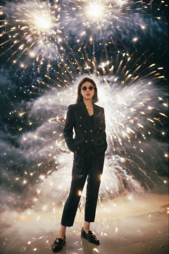 an asian girl,film grain texture,analog photography aesthetic,fire,fireworks,night,<lora:disillusion · fireworks_SDXL:1>,sunglasses,dynamic angle,(Tailored_blazer:1.4),(Pleated_trousers:1.3),(Pointed-toe_loafers:1.2),