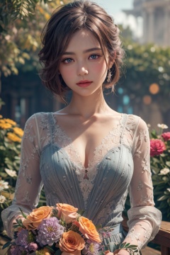 woman,flowers (innocent grey),exposure blend, medium shot, bokeh, (hdr:1.4), high contrast, (cinematic, teal and orange:0.85), (muted colors, dim colors, soothing tones:1.3), low saturation