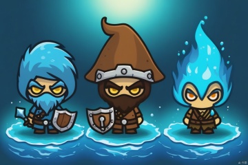 Three game characters, water elemental barbarian wizard