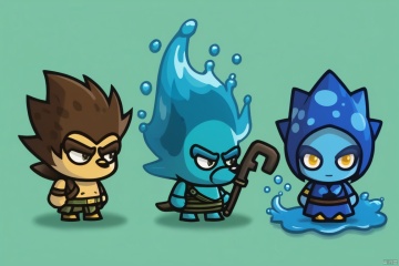 Three game characters, water elemental hedgehog