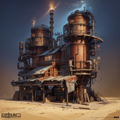 (masterpiece:1.2), best quality, masterpiece, cyber style factory, metal texture, complex pipe composition, rich details, metal hoses, gears, metal sheets, complexity, perfect lighting, CG,realism,unreal engine,concept art,building,