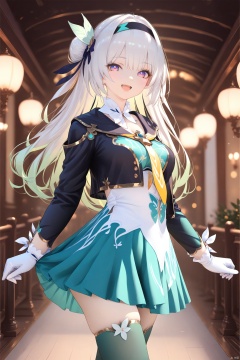 long hair,breasts,fireflySR,bangs,hair ornament,gloves,dress,hair between eyes,purple eyes,multicolored hair,white hair,hairband,elbow gloves,white gloves,black hairband,skirt,green thighhighs,long sleeves,ribbon,jacket,hair ribbon,hairband,yellow necktie,black jacket,wavy hair,cropped jacket,black footwear,