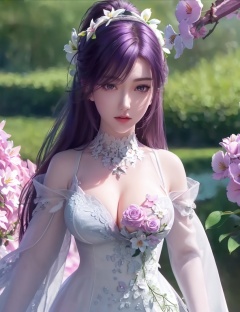 <lora:520-DA-诛仙CG-陆雪琪:0.8>(,1girl, ,best quality, ),looking at viewer,  ,ultra detailed 8k cg,ultra detailed background,ultra realistic 8k cg,1girl, solo,(bare shoulders:0.85),(masterpiece, best quality),((oil painting style)),sexy young lady,(beautiful face and eyes),(upper body:1.5),(whole body:1.05),(single person:1.2),surrounded by flowers, (lily), roses, floret, vegetation, white, purple, purplish pink,Impressionism,colorful,(Breast size:1.3),(cleavage),