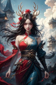 {Very detailed lighting}, {paintings}, {{very detailed 8K CG wallpaper}}, (Good quality, best quality, art, beauty and aesthetics: 1.2) It was a man with brunette hair, antlers on his head, lightning forehead marks, blood eyes, golden eyeballs, handsome features evil charm, evil smile at the audience, left evil smile split lips There is a fighting suit in the Chinese martial arts Fairy ink painting, wearing a black and red cloak, the momentum of the king, the splashing details, the scholar and, Mecha, daughter of the Dragon King, jijianchahua