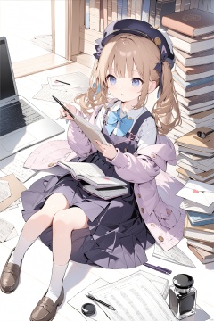 (masterpiece),(best quality),(loli),(petite),1girl, bangs, blue_eyes, book, book_stack, bookmark, brown_hair, clipboard, envelope, eraser, floating_book, grimoire, hair_ribbon, hat, holding, holding_book, holding_letter, holding_paper, holding_pen, inkwell, jacket, laptop, letter, library, loafers, long_hair, long_sleeves, love_letter, lying, manga_\(object\), map, mechanical_pencil, menu, newspaper, notebook, notepad, on_back, open_book, paper, paper_airplane, papers, parted_lips, pen, pencil, pencil_case, pinafore_dress, quarter_note, quill, reading, ribbon, school_uniform, sheet_music, shoes, sketchbook, skirt, socks, solo, tablet_pc, twintails, white_legwear