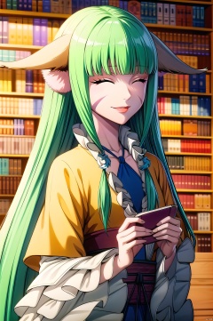Rongrong, 1girl, solo, animal ears, long hair, closed eyes, green hair, book, facial mark, smile, blunt bangs, bangs, holding, bookshelf,nice hands,(highres, high quality:1.3),intricate details,sharp focus,depth of field,
