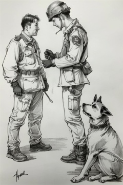 ((HRD, HUD, 8K)),((masterpiece, best quality)), highly detailed, soft light,Sketching - MultipleCharacters, monochrome, greyscale, helmet, boots, traditional media, 1boy, male focus, signature, uniform, dog, gloves, animal, standing, military, from side, <lora:20240412-1712917031577:0.8>
