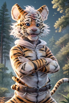 Best quality,8k, animal,(solo:1.3), (tigger:1.5), blue eyes,smile, [orange|white hair:10],forest,