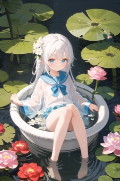 loli, petite, long hair, floating hair, messy hair, 1girl, white hair, white jacket, afloat, air bubble, bathtub, beach, berry, blue eyes, blue flower, bouquet, bow, braid, bubble, camellia, caustics, clover, coral, daisy, floral background, flower, food, fruit, hibiscus, horizon, hydrangea, in water, leaf, lily \(flower\), lily of the valley, lily pad, long sleeves, looking at viewer, lotus, ocean, partially submerged, petals on liquid, pink flower, purple flower, rain, red flower, ripples, rose, sailor collar, shallow water, snowflakes, soaking feet, solo, submerged, waves, white rose, yellow flower,,,,,, mz-hd, backlight