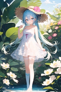 cocktail dress, c hat,  long messy hair, pink and blue,  loose socks,  straw hat,white thighhighs,barefoot, leg ribbon, ,