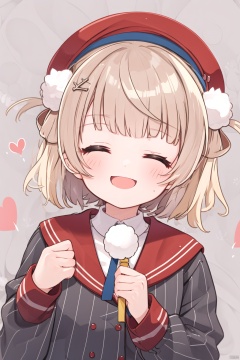 1girl, solo, blush, smile, short hair, open mouth, bangs, shirt, hair ornament, long sleeves, hat, jacket, closed eyes, white shirt, upper body, braid, heart, striped, virtual youtuber, sailor collar, beret, light brown hair, red headwear, facing viewer, pom pom \(clothes\), hair rings, red sailor collar, pom pom hair ornament